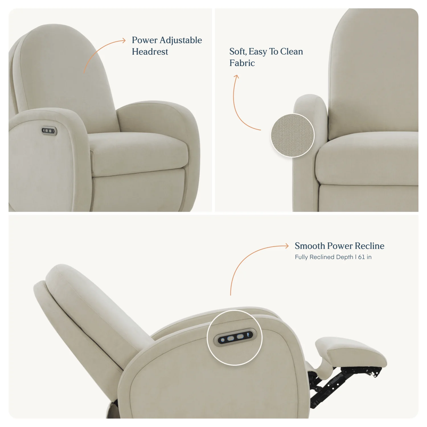 The Austin Glider brings sculptural style and everyday comfort to the nursery. Its curved arms, rounded silhouette and tall, supportive back add personality to any space. A smooth power recline and glide, non-toxic stain-resistant fabric and a built-in charging port make it easy to settle in for feeding and bonding moments.