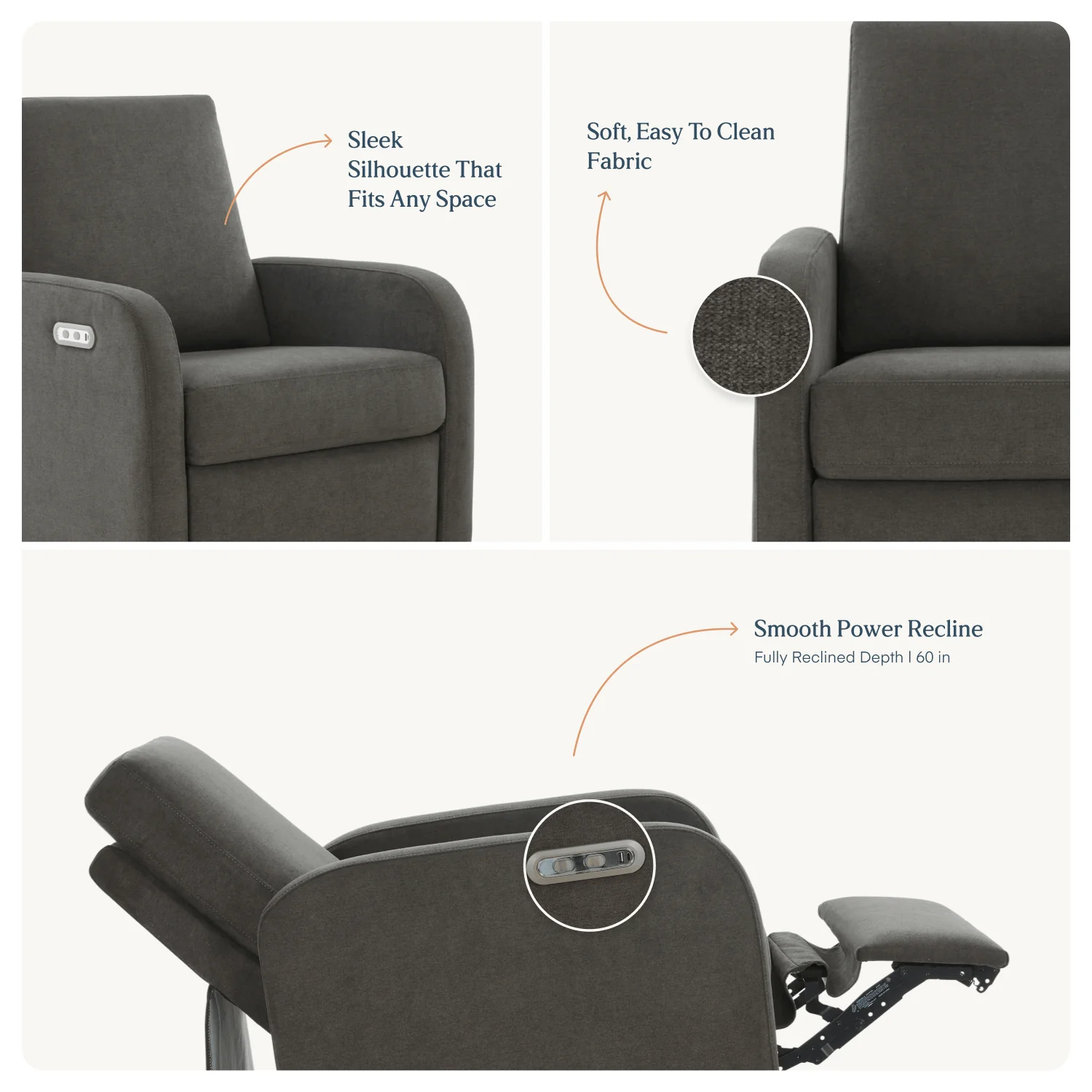 The Porto Glider blends a soft, modern silhouette with supportive comfort. With a smaller footprint that fits naturally in nurseries and shared spaces, it offers smooth power recline and a gentle glide for calm, relaxed moments at home. Stain-resistant, non-toxic fabric and a built-in charging port bring ease to everyday living.